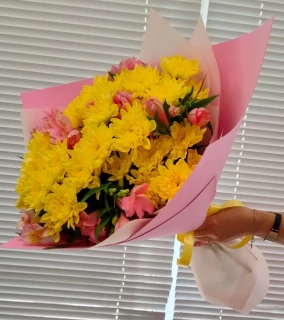 Ощущая нежное прикосновение первых лучей утреннего солнца, этот букет словно окутывает своим теплом и нежностью. Желтые воздушные хризантемы притягиваются к свету, создавая атмосферу радости и оптимизма. Нежные альстромерии, словно мягкие облака на небе, добавляют воздушности и изысканности композиции. Букет, оформленный в крафтовую упаковку, придает ему естественность и некую загадочность. Испытайте чарующую магию этого букета и подарите его любимому человеку, чтобы принести в его жизнь тепло и счастье.