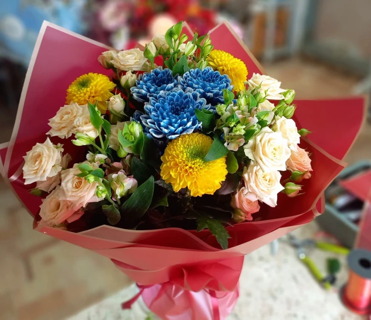 Завораживающий букет, воплощение нескончаемой элегантности и изысканности. Роскошные кустовые и одноголовые хризантемы в нежных оттенках, аккуратно дополняются изящными кустовыми розами и альстромериями. Лепестки хризантем, словно ожившие капли дождя, создают изысканный рисунок, подчеркивая причудливую форму букета. Он сверкает в элегантной упаковке, вызывая источников положительных эмоций и восхищения. Великолепный выбор для самых особенных случаев, где каждая деталь должна отправить все чувства на взлет.